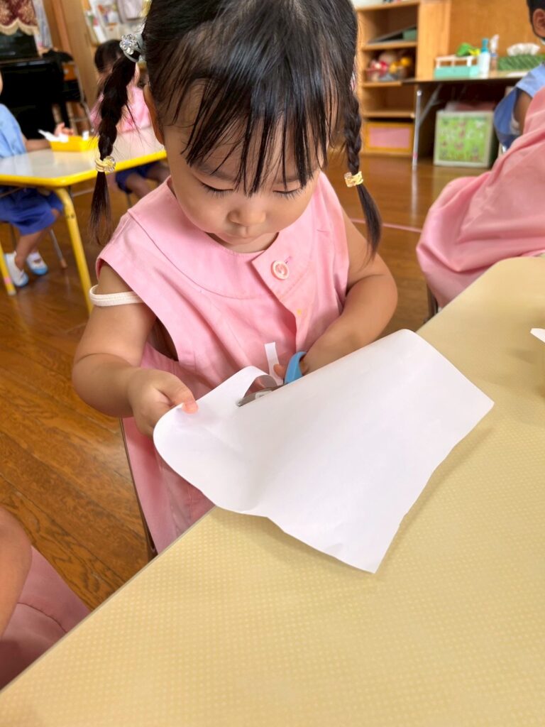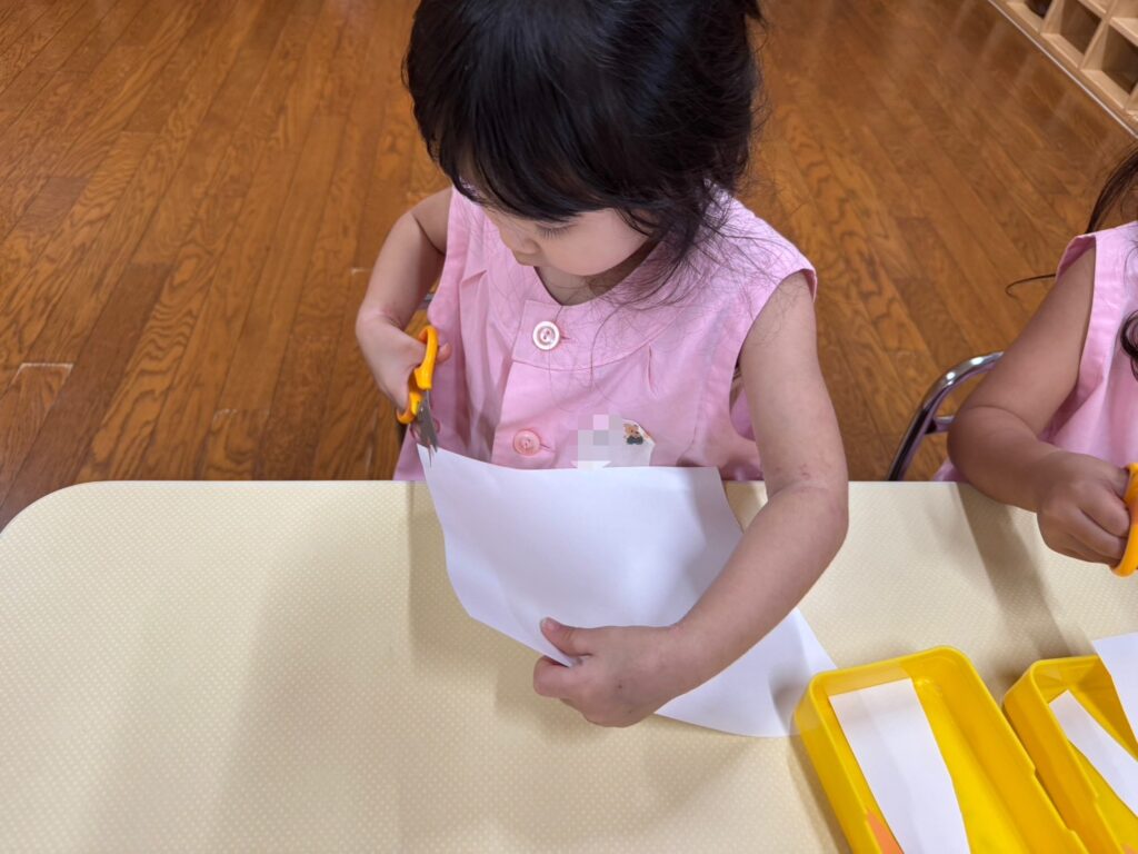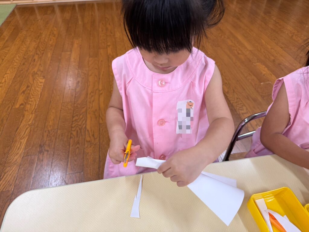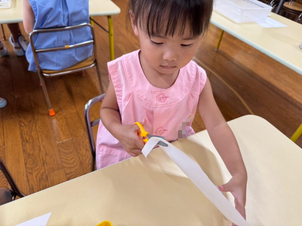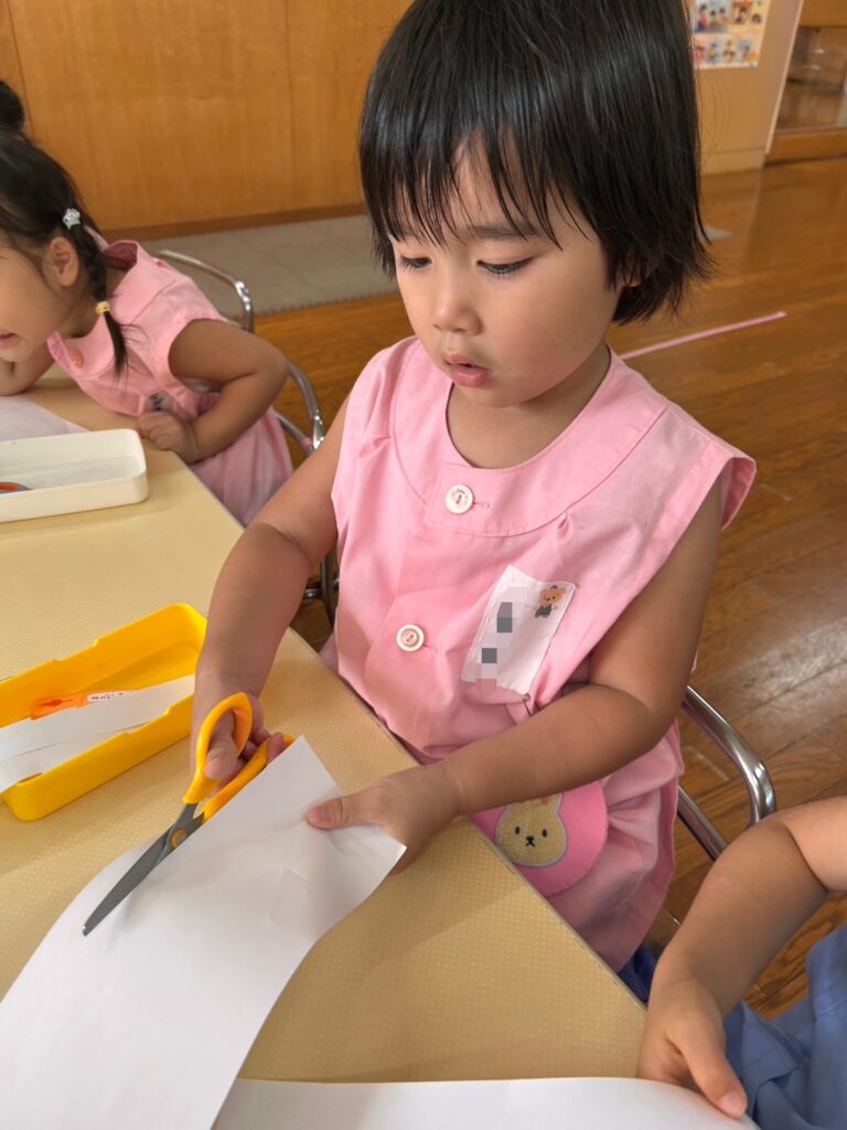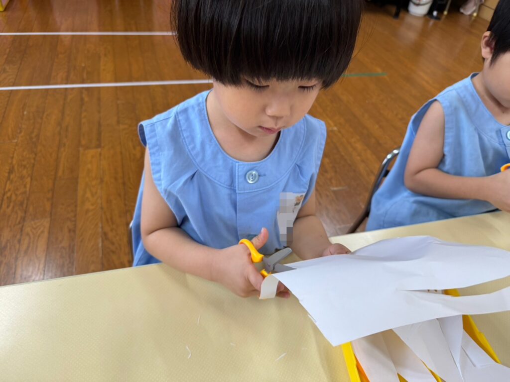 ハサミも久しぶりに使いましたよ!持ち方に気をつけながら慎重に慎重に…細長く紙を切り「ヘビさん!」「うどん!」という声も聞こえてきました🐍