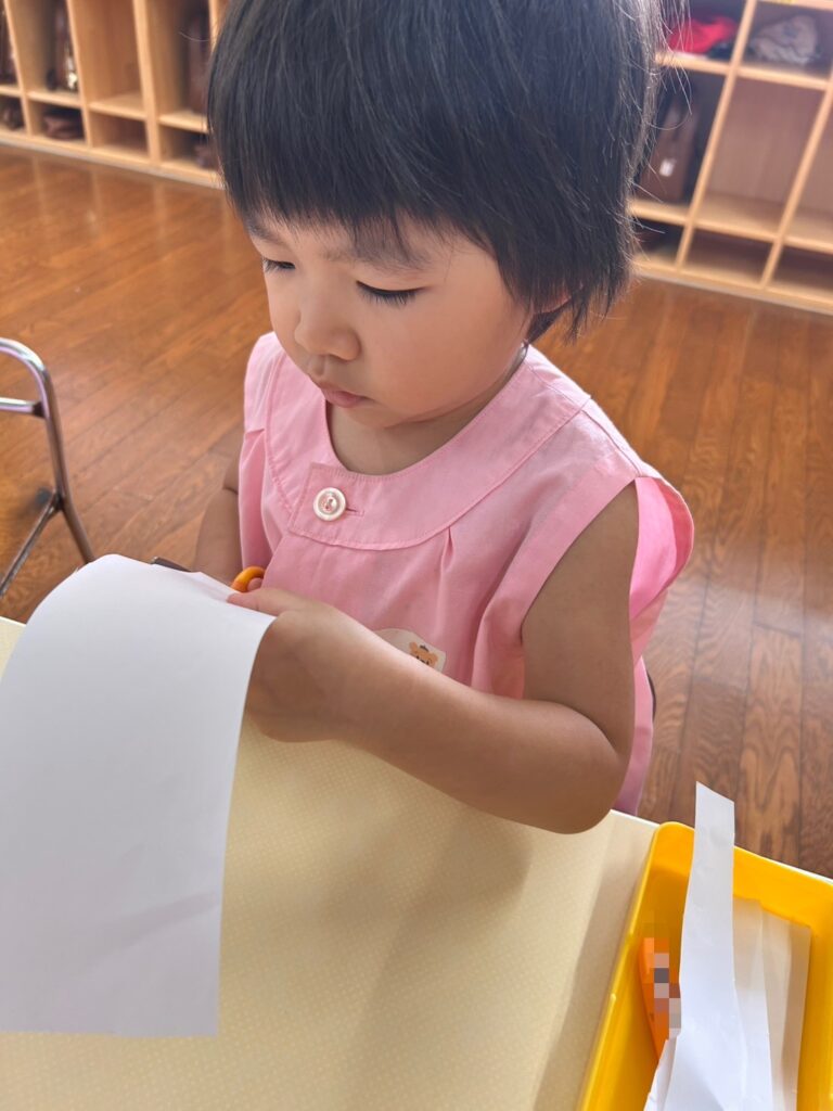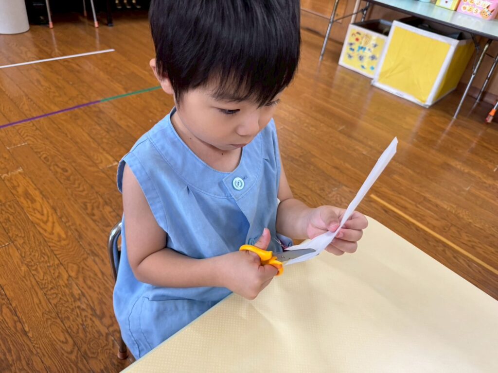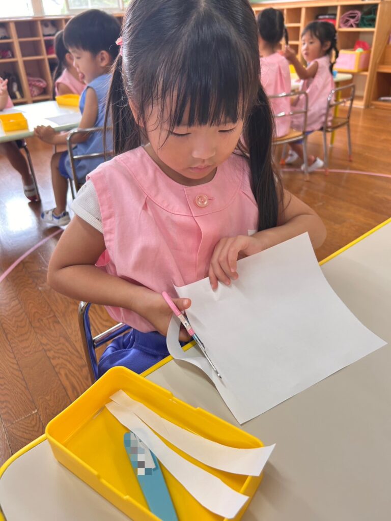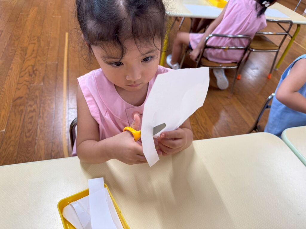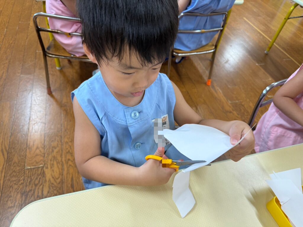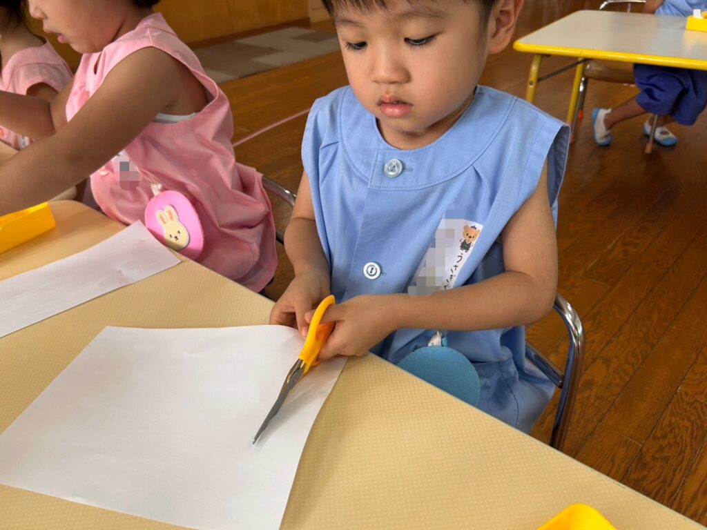 ハサミも久しぶりに使いましたよ!持ち方に気をつけながら慎重に慎重に…細長く紙を切り「ヘビさん!」「うどん!」という声も聞こえてきました🐍