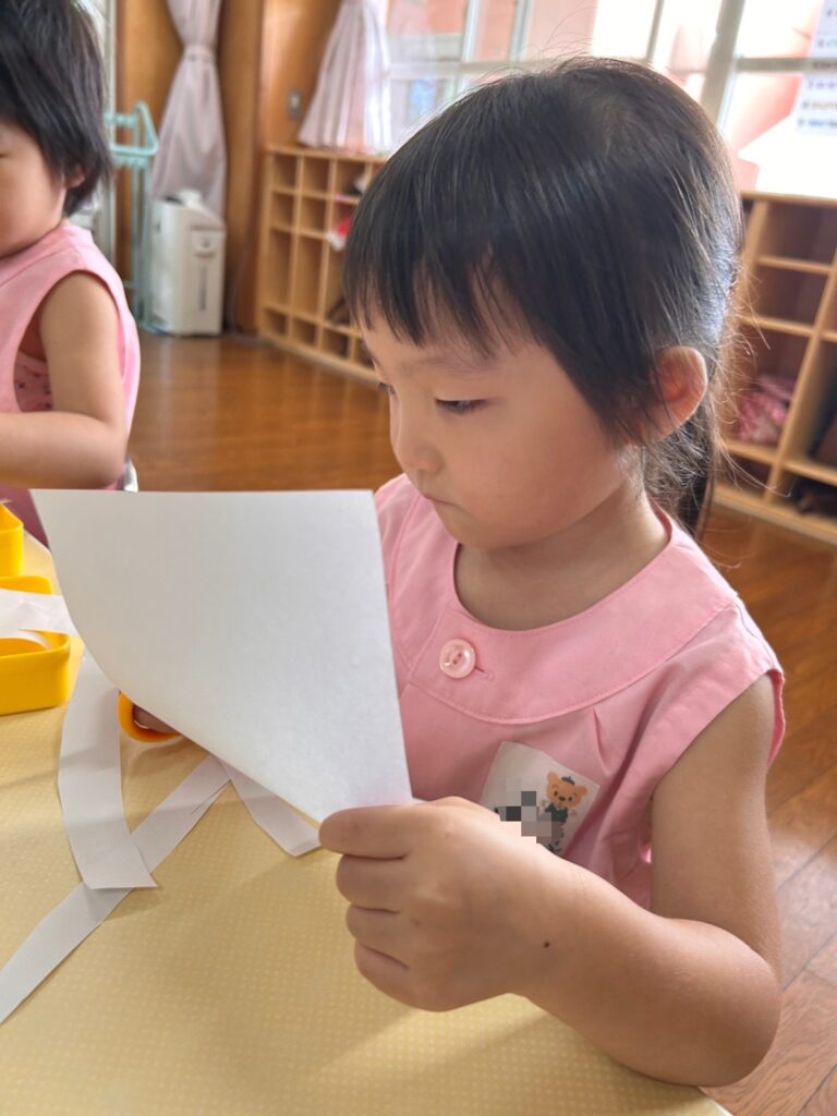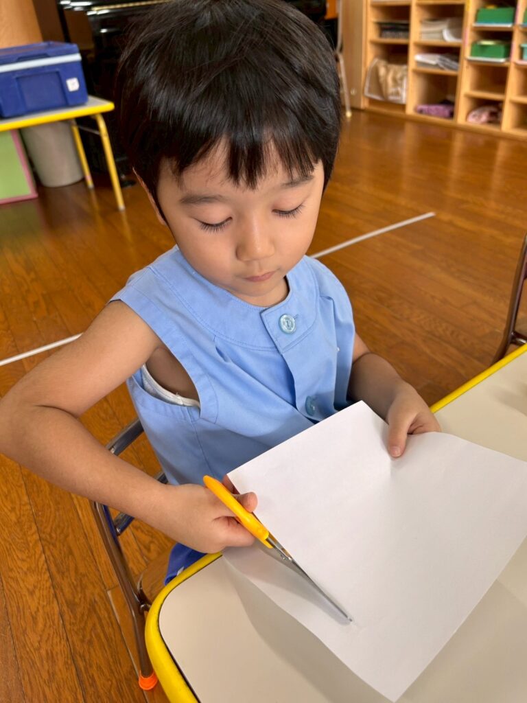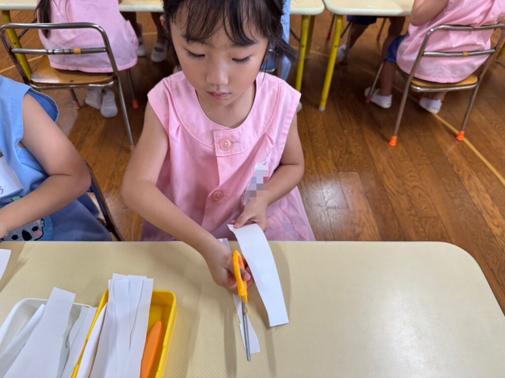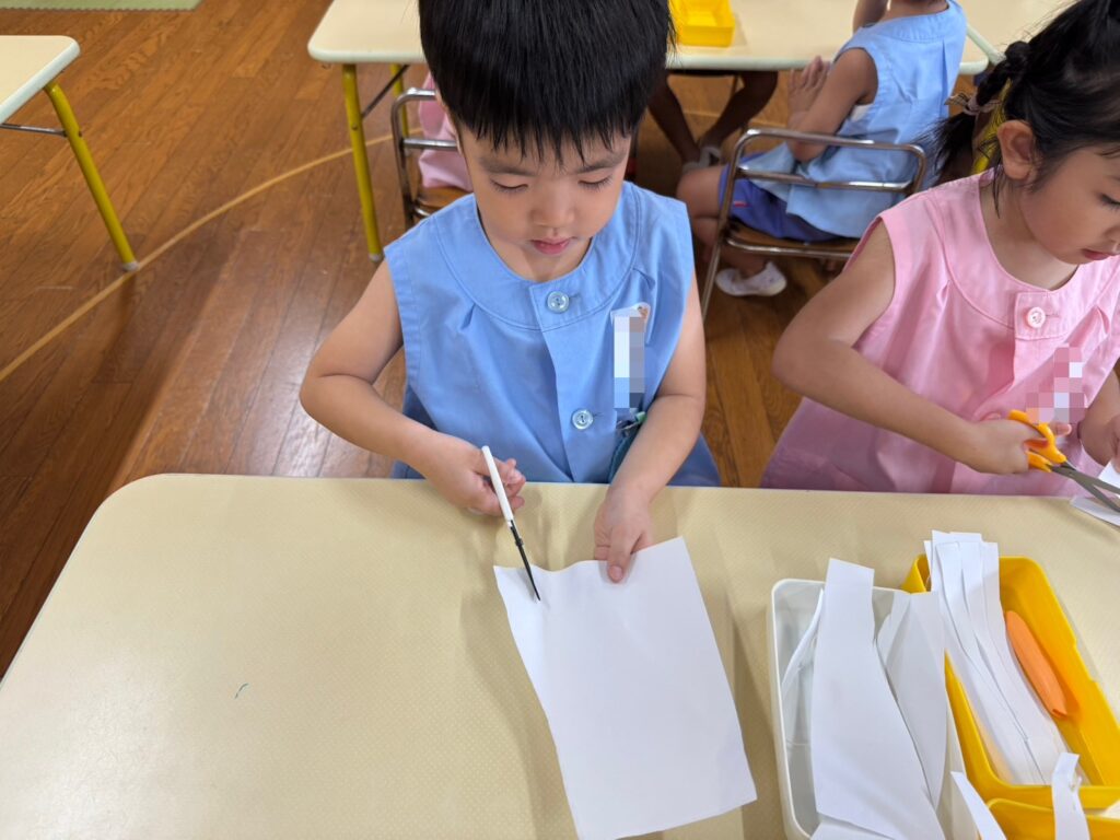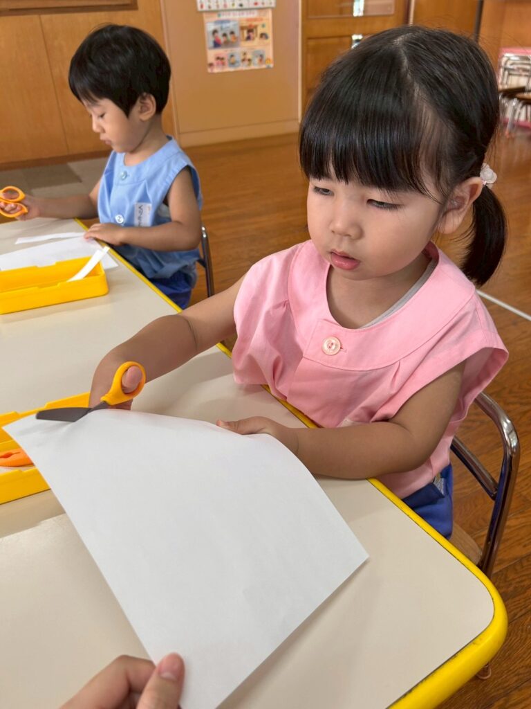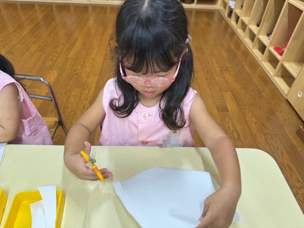 ハサミも久しぶりに使いましたよ!持ち方に気をつけながら慎重に慎重に…細長く紙を切り「ヘビさん!」「うどん!」という声も聞こえてきました🐍