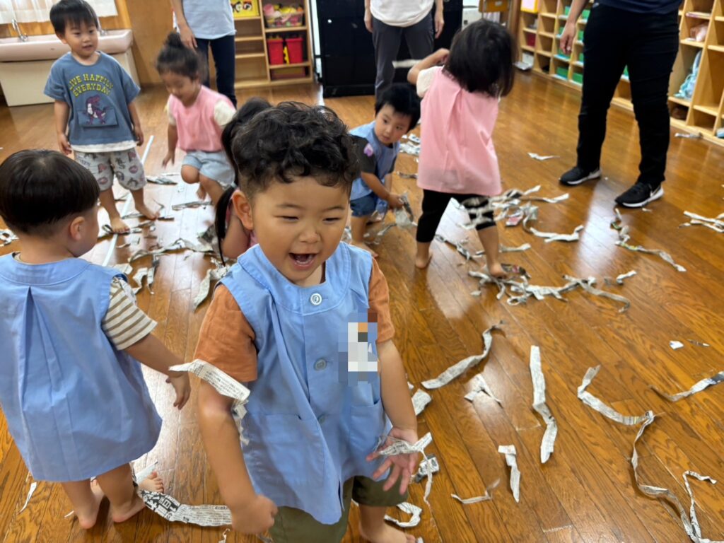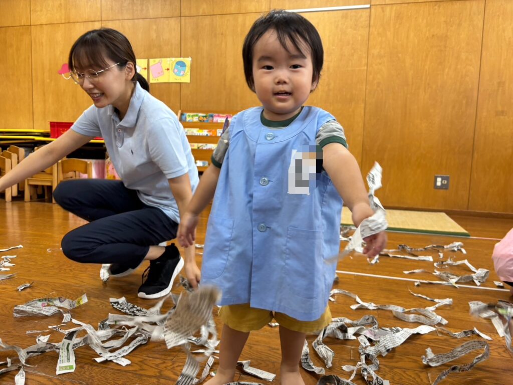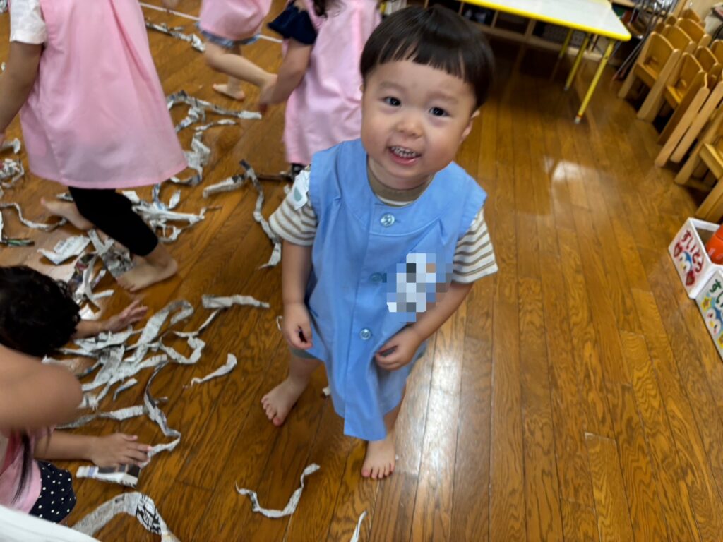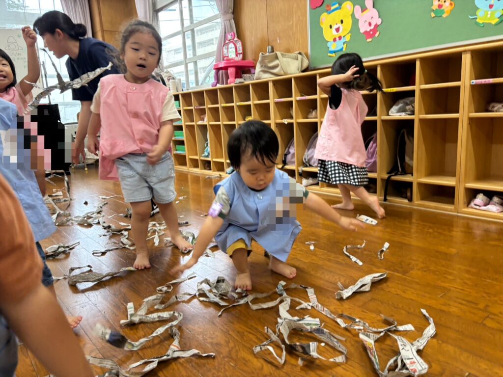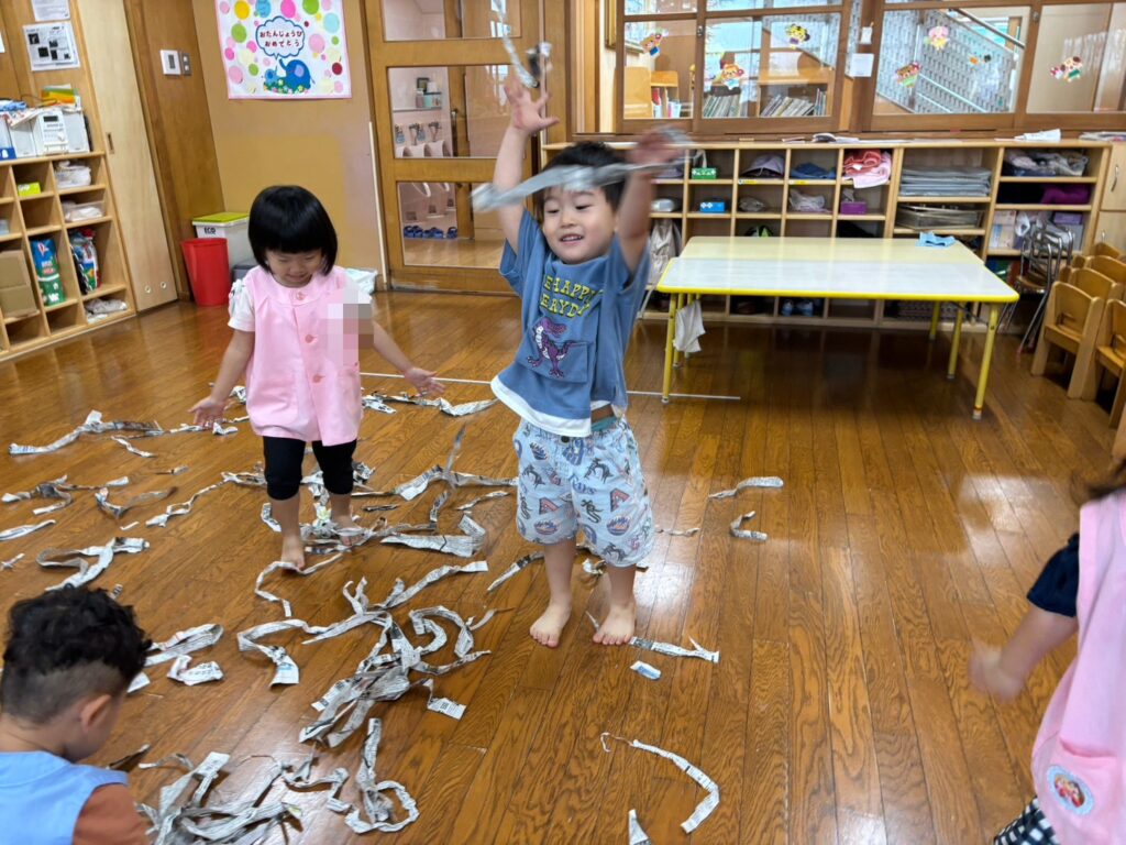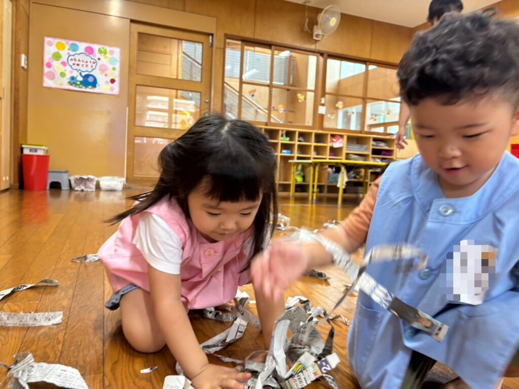 投稿日: 2025年10月28日2025年10月28日 投稿者: 投稿者新聞紙あそび📰(ぺんぎんさん) 新聞紙で遊びました☺️広げるとお友達の体くらいに大きな新聞紙を細くちぎって「へびさん!」「ちゅるちゅるらーめん🍜」と大盛り上がりでしたよ! 上から降ってくる新聞紙の雨を夢中で追いかける姿が可愛らしかったです🩷