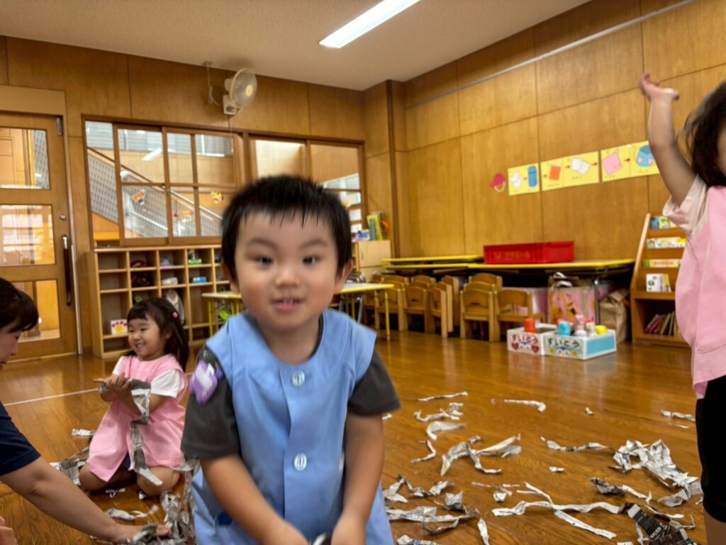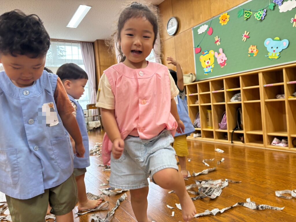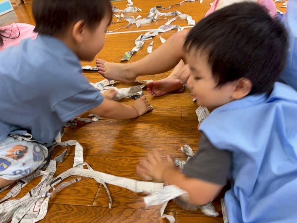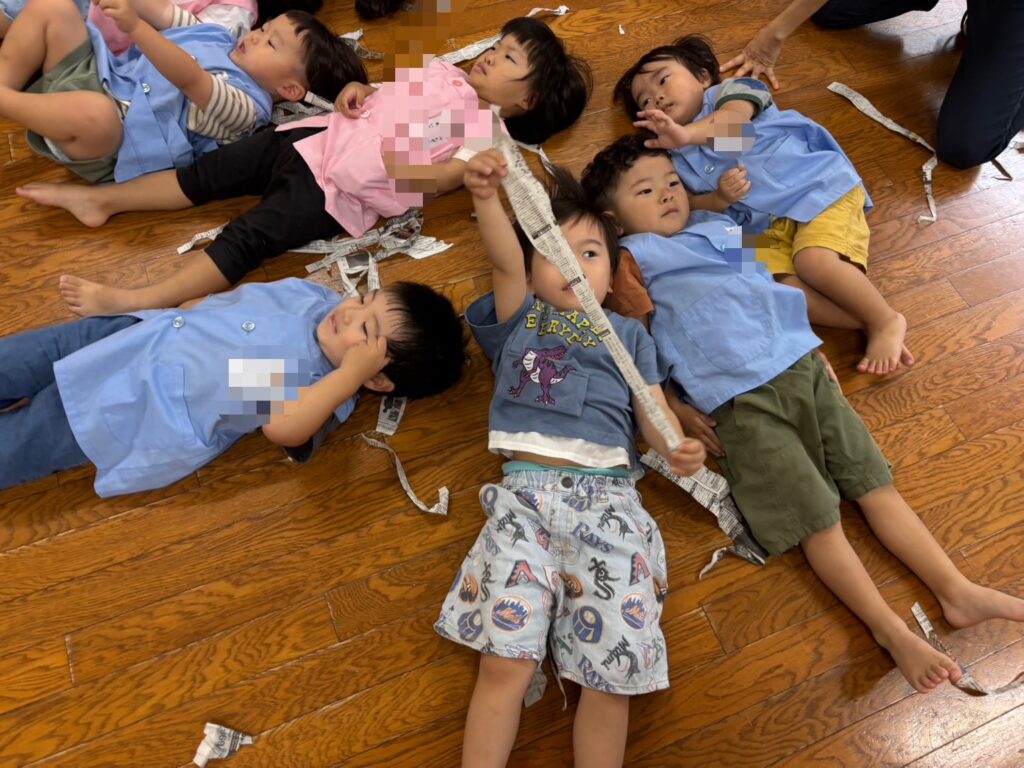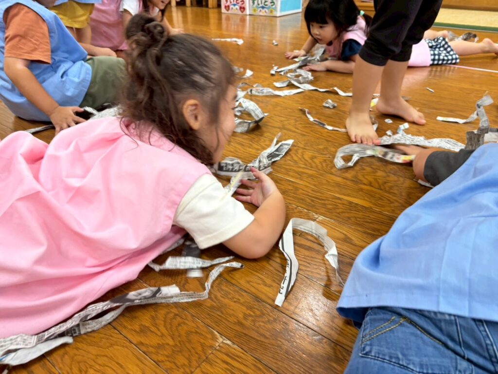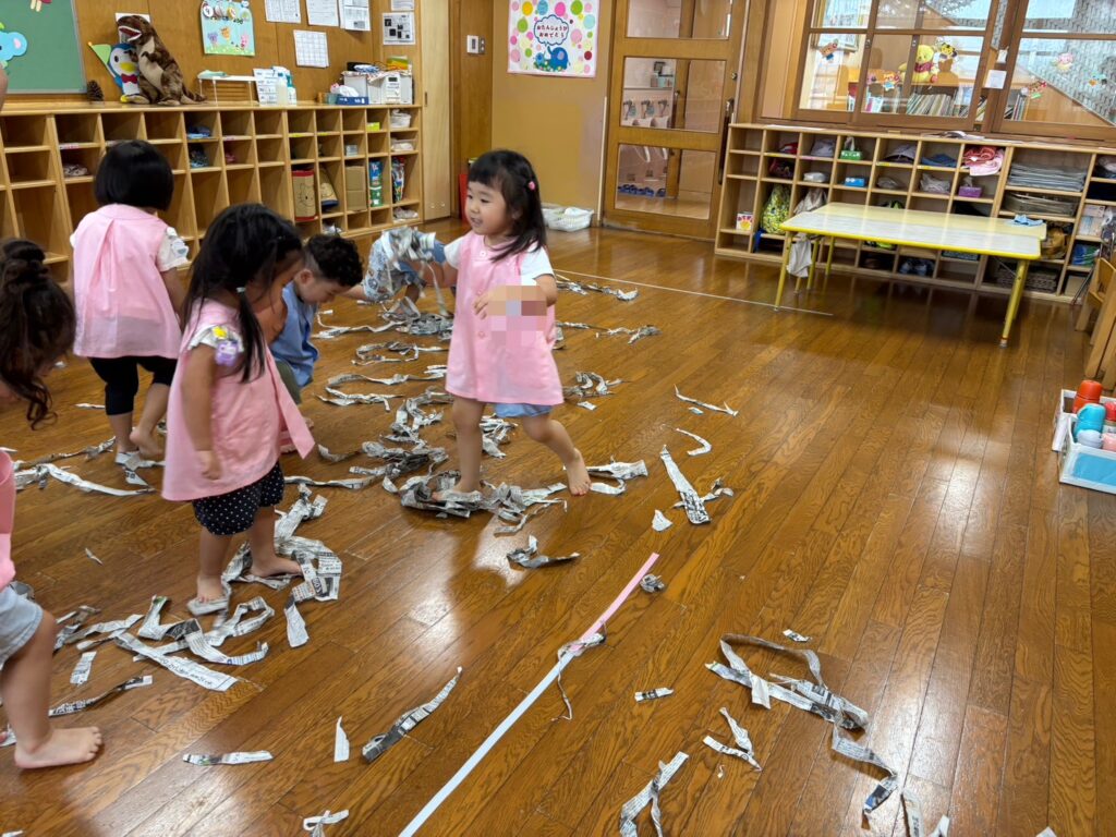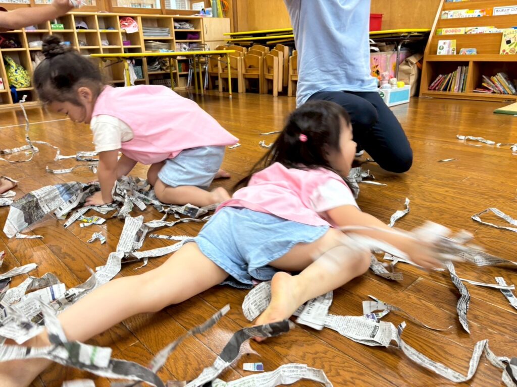 投稿日: 2025年10月28日2025年10月28日 投稿者: 投稿者新聞紙あそび📰(ぺんぎんさん) 新聞紙で遊びました☺️広げるとお友達の体くらいに大きな新聞紙を細くちぎって「へびさん!」「ちゅるちゅるらーめん🍜」と大盛り上がりでしたよ! 上から降ってくる新聞紙の雨を夢中で追いかける姿が可愛らしかったです🩷