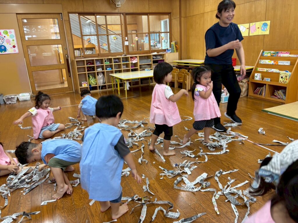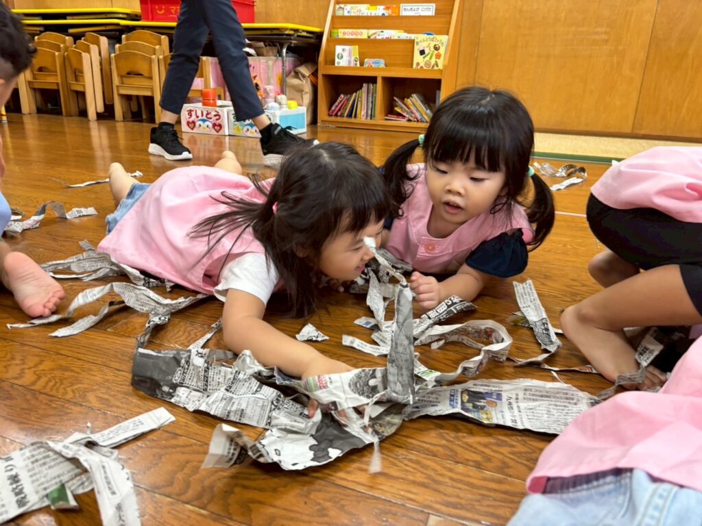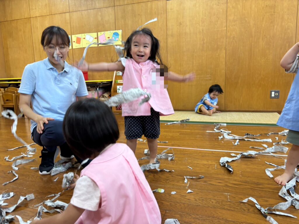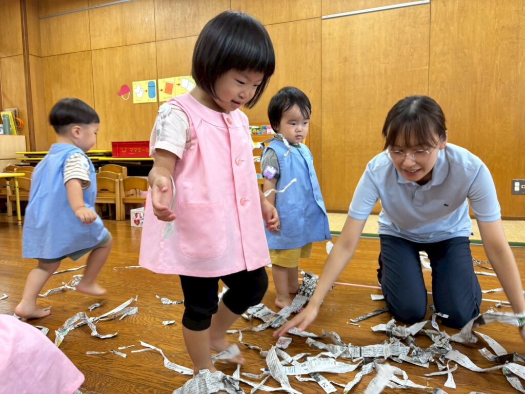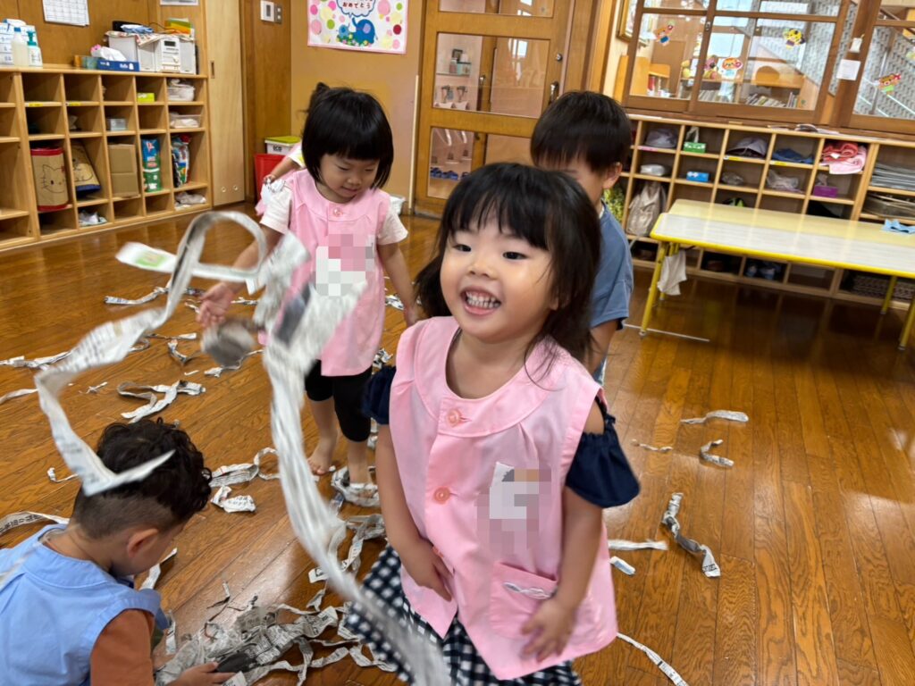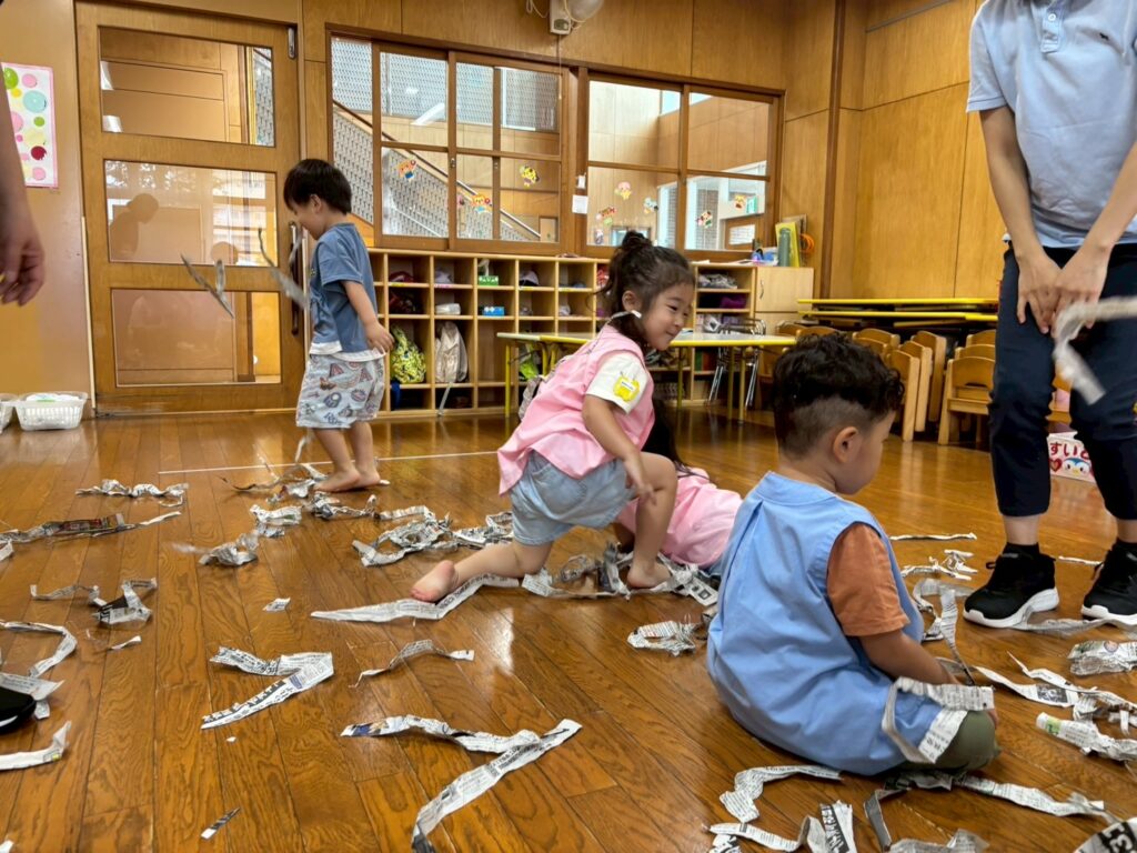 投稿日: 2025年10月28日2025年10月28日 投稿者: 投稿者新聞紙あそび📰(ぺんぎんさん) 新聞紙で遊びました☺️広げるとお友達の体くらいに大きな新聞紙を細くちぎって「へびさん!」「ちゅるちゅるらーめん🍜」と大盛り上がりでしたよ! 上から降ってくる新聞紙の雨を夢中で追いかける姿が可愛らしかったです🩷