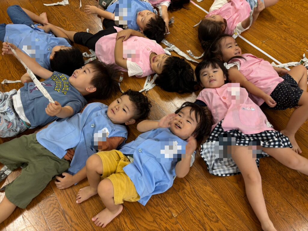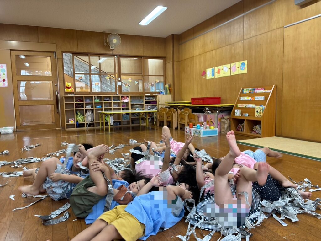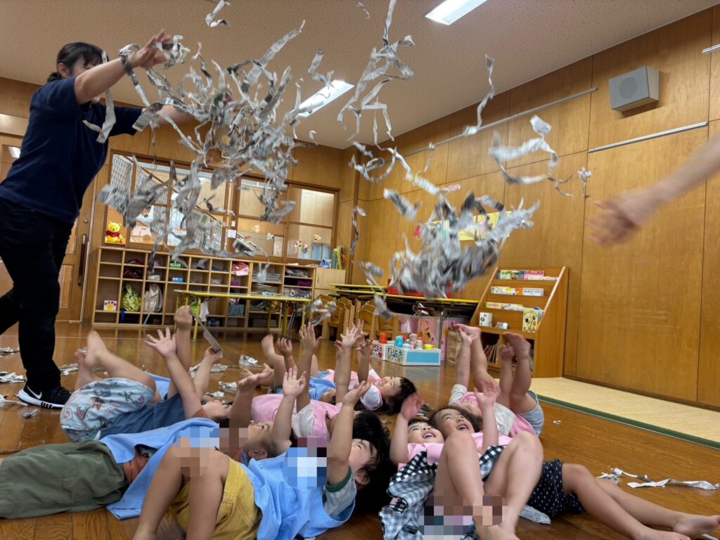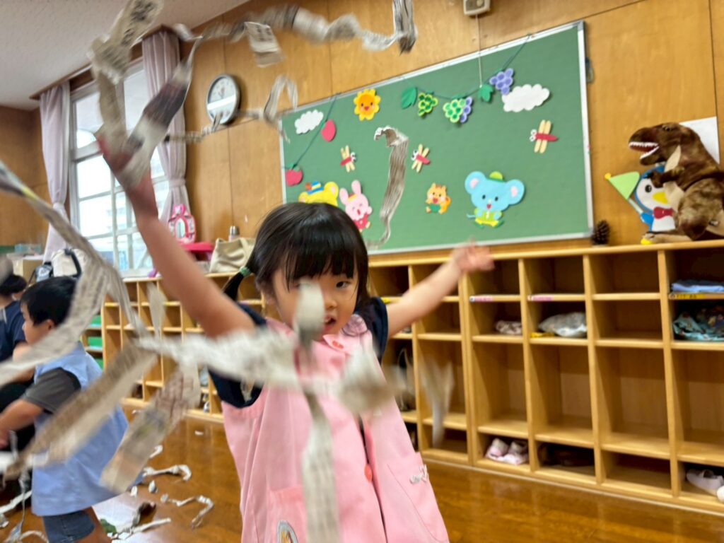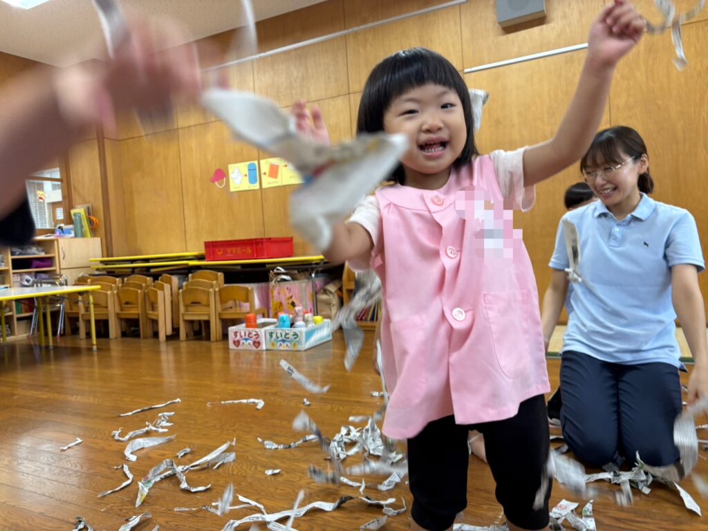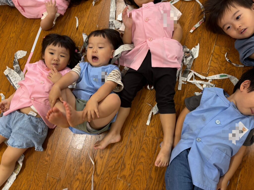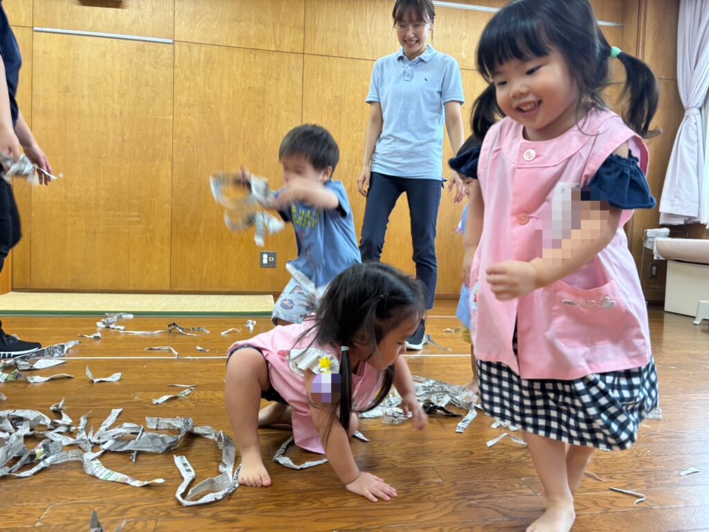 投稿日: 2025年10月28日2025年10月28日 投稿者: 投稿者新聞紙あそび📰(ぺんぎんさん) 新聞紙で遊びました☺️広げるとお友達の体くらいに大きな新聞紙を細くちぎって「へびさん!」「ちゅるちゅるらーめん🍜」と大盛り上がりでしたよ! 上から降ってくる新聞紙の雨を夢中で追いかける姿が可愛らしかったです🩷